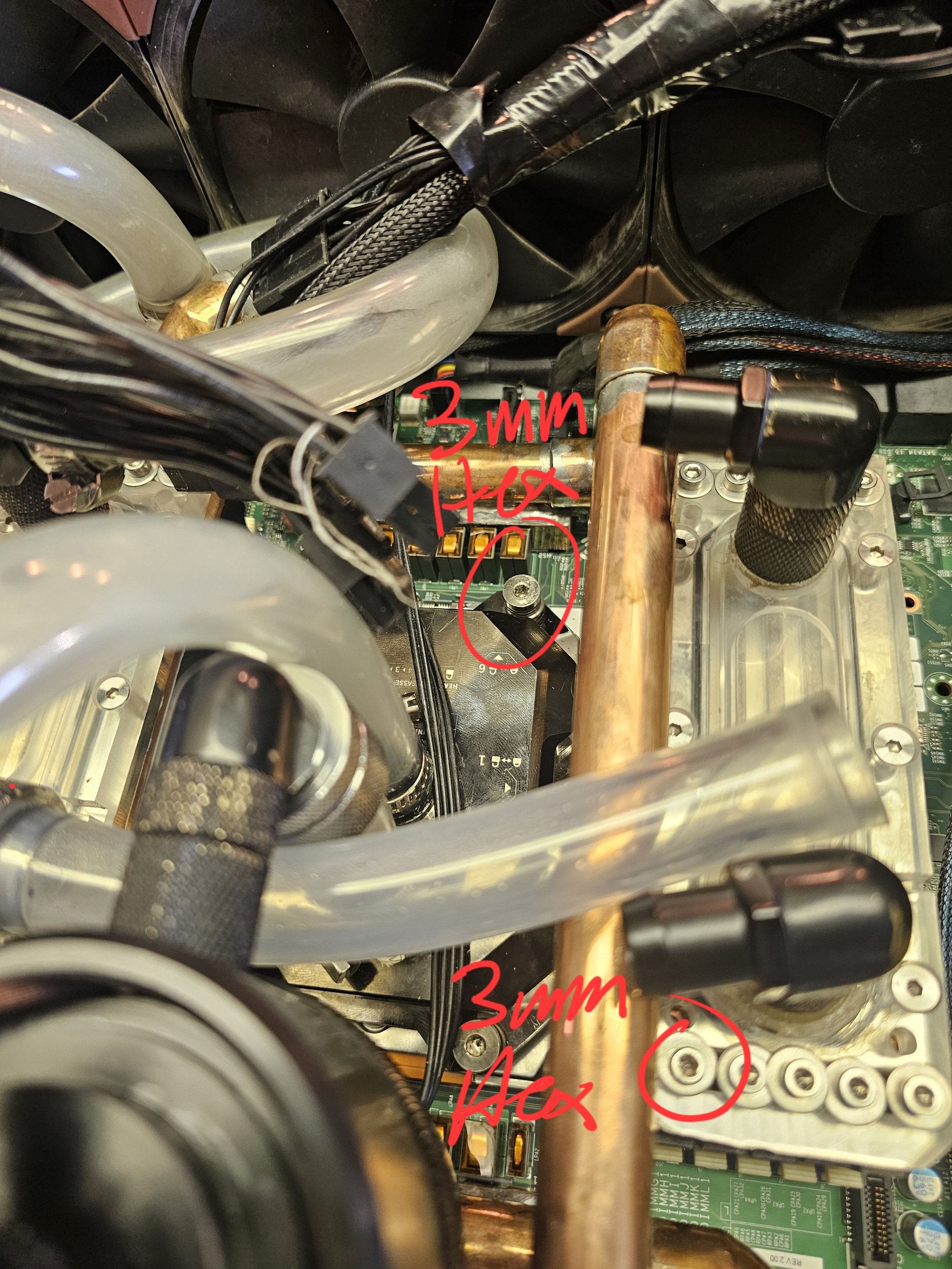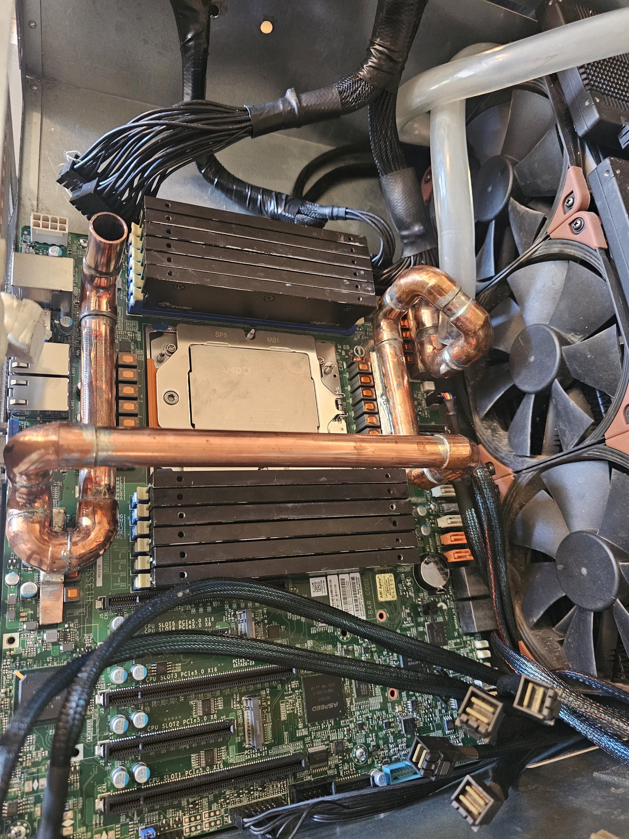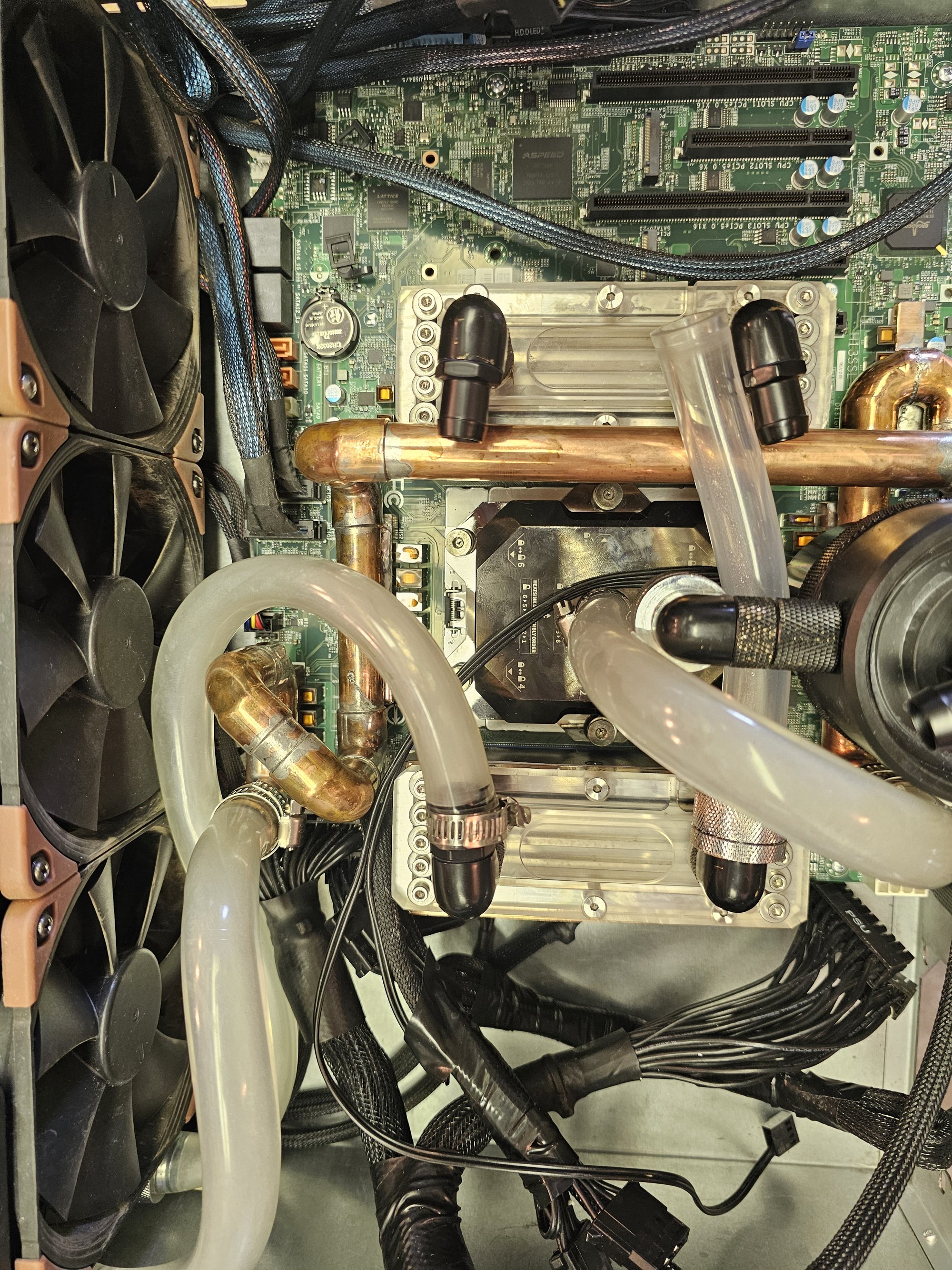 The fans are all noctua 3000rpm ippc, though they never need to run at that speed. The VRMs are cooled with a custom "waterblock" made with soldered copper pipe and square barstock. 2x 4-40 blind tapped holes are in each bar to mimic the original plastic quick connects from the old heatsinks. This was accomplished by using the mobo as a stencil against a 1/2in thick plate of aluminum. The barstock pieces were attached and the pipe noodle was built up from there. You need a thick baseplate to prevent heat warping while you solder.