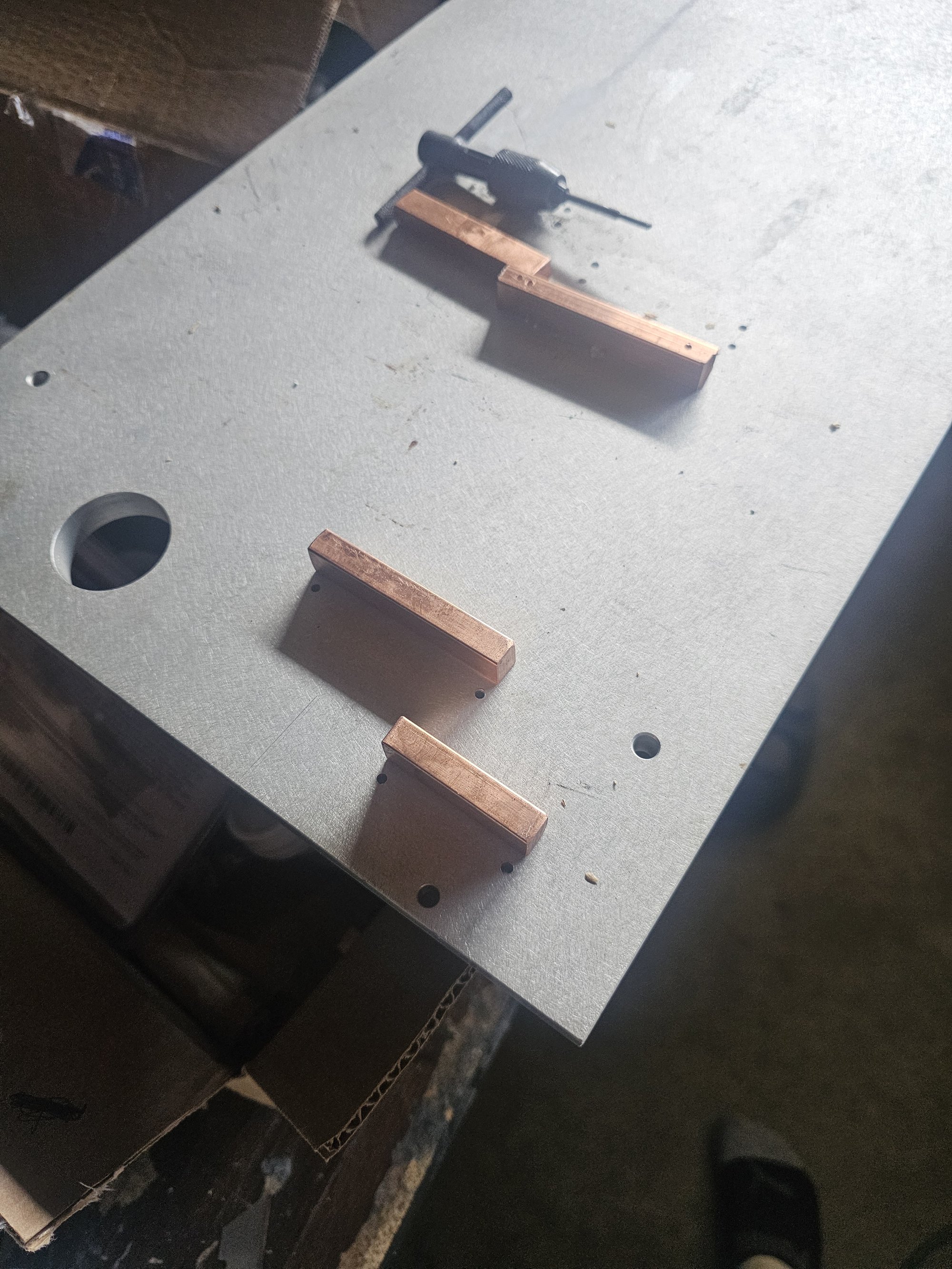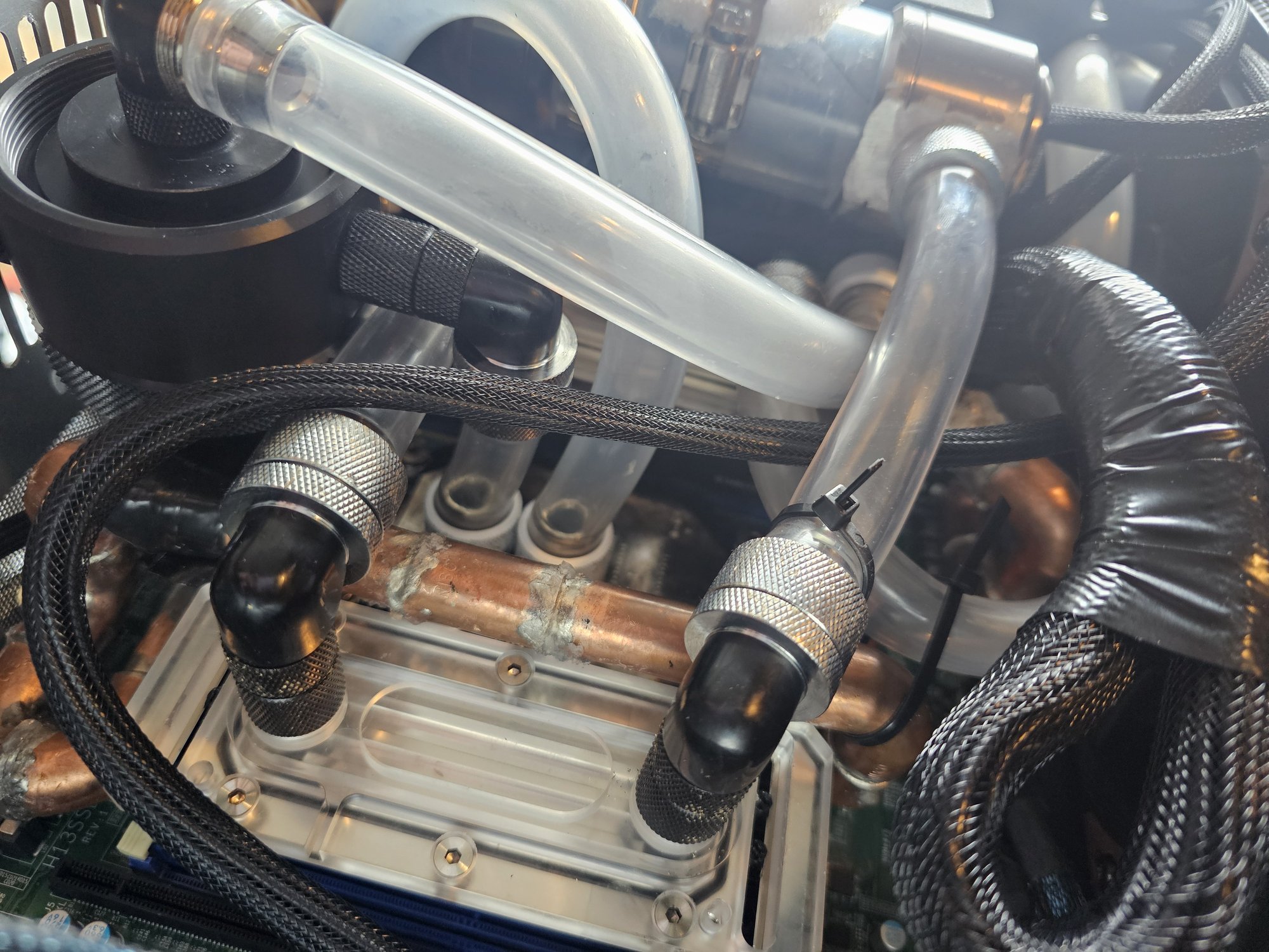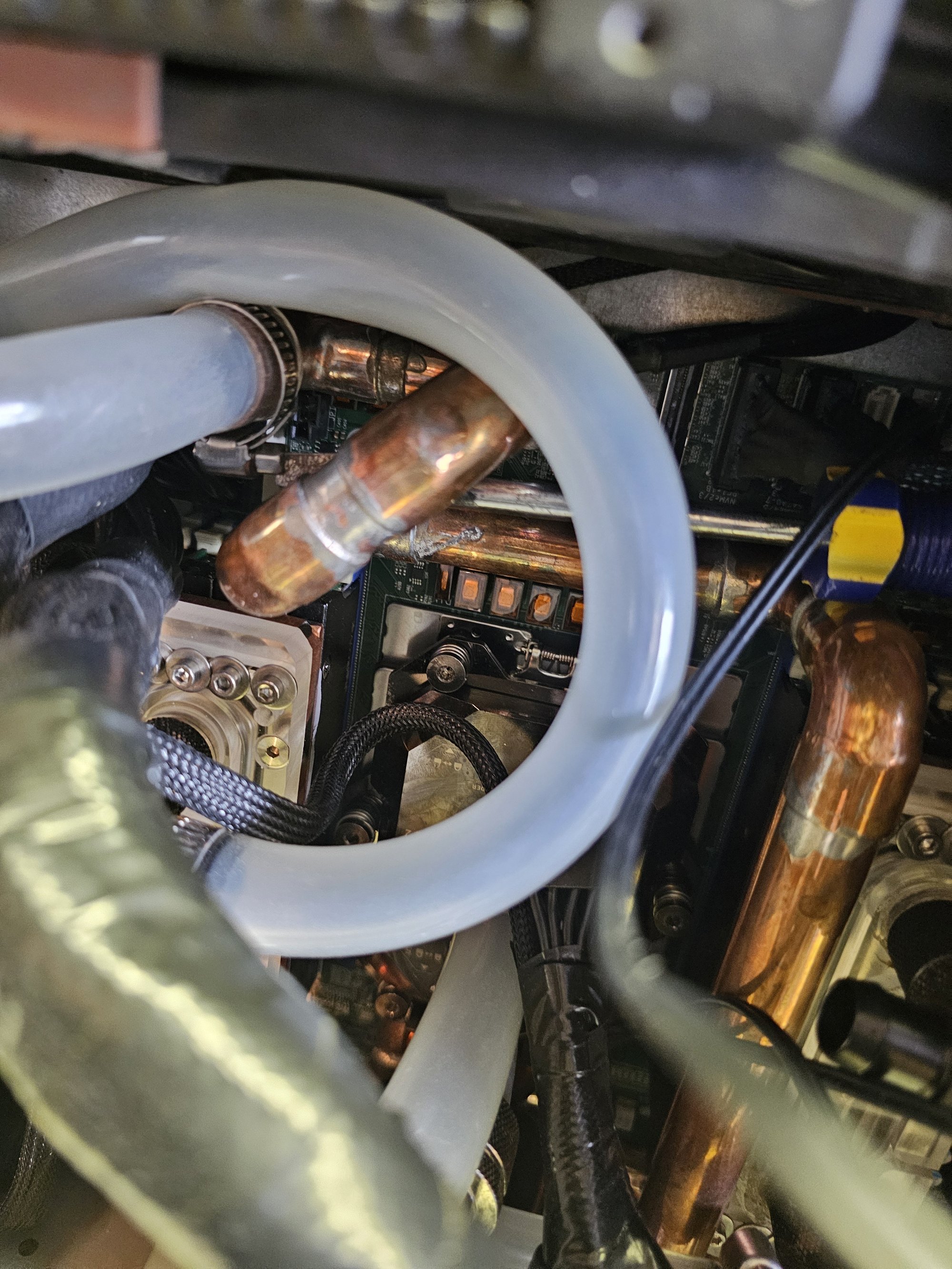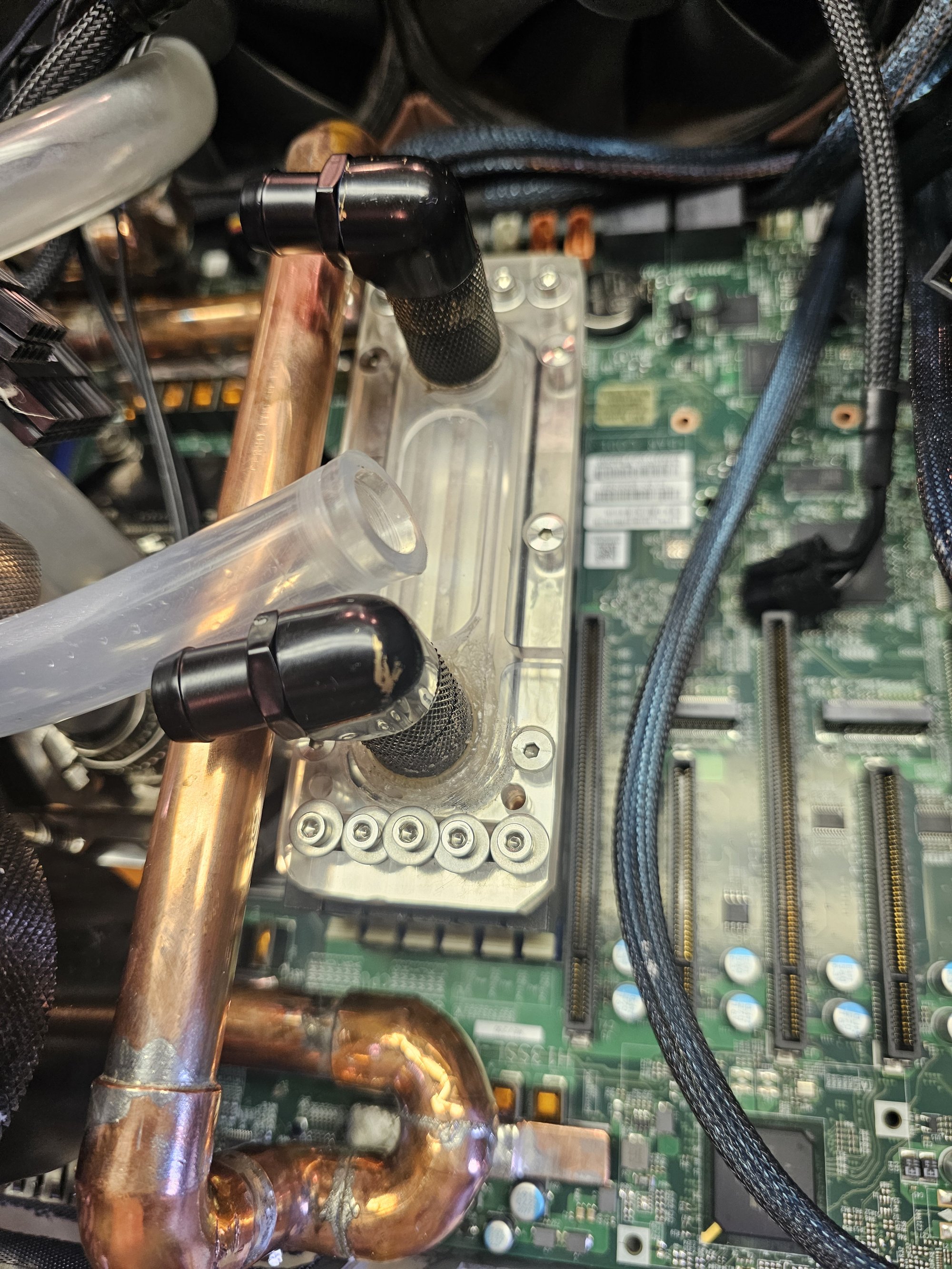 The fans are all noctua 3000rpm ippc, though they never need to run at that speed. The VRMs are cooled with a custom "waterblock" made with soldered copper pipe and square barstock. 2x 4-40 blind tapped holes are in each bar to mimic the original plastic quick connects from the old heatsinks. This was accomplished by using the mobo as a stencil against a 1/2in thick plate of aluminum. The barstock pieces were attached and the pipe noodle was built up from there. You need a thick baseplate to prevent heat warping while you solder.