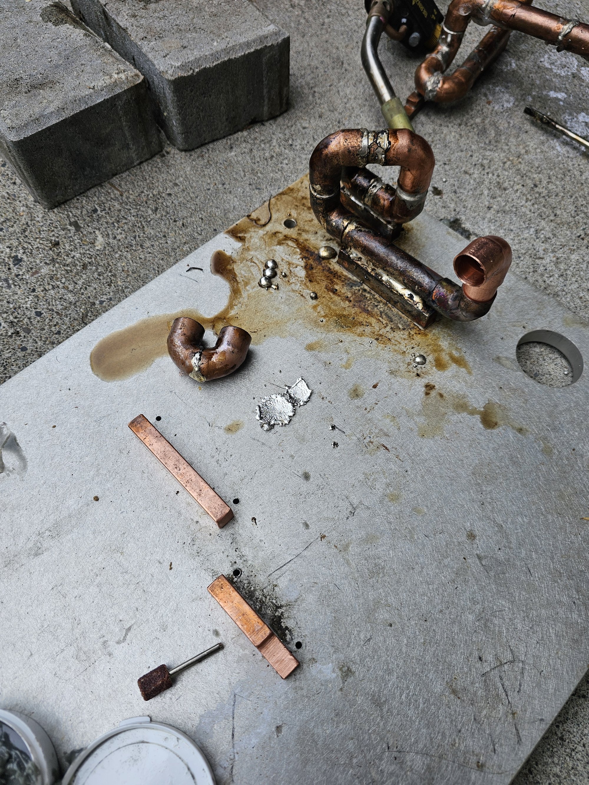 The copper noodle has a finishing step where I "purged?" it with lye to try and react away some of the excess solder. The relative surface area to depth of the solder joints to excess "film" is such that this method is extremely practical. I did this to lower the surface area contact of the solder to the water to limit the amount of tin and silver that wind up in it.
