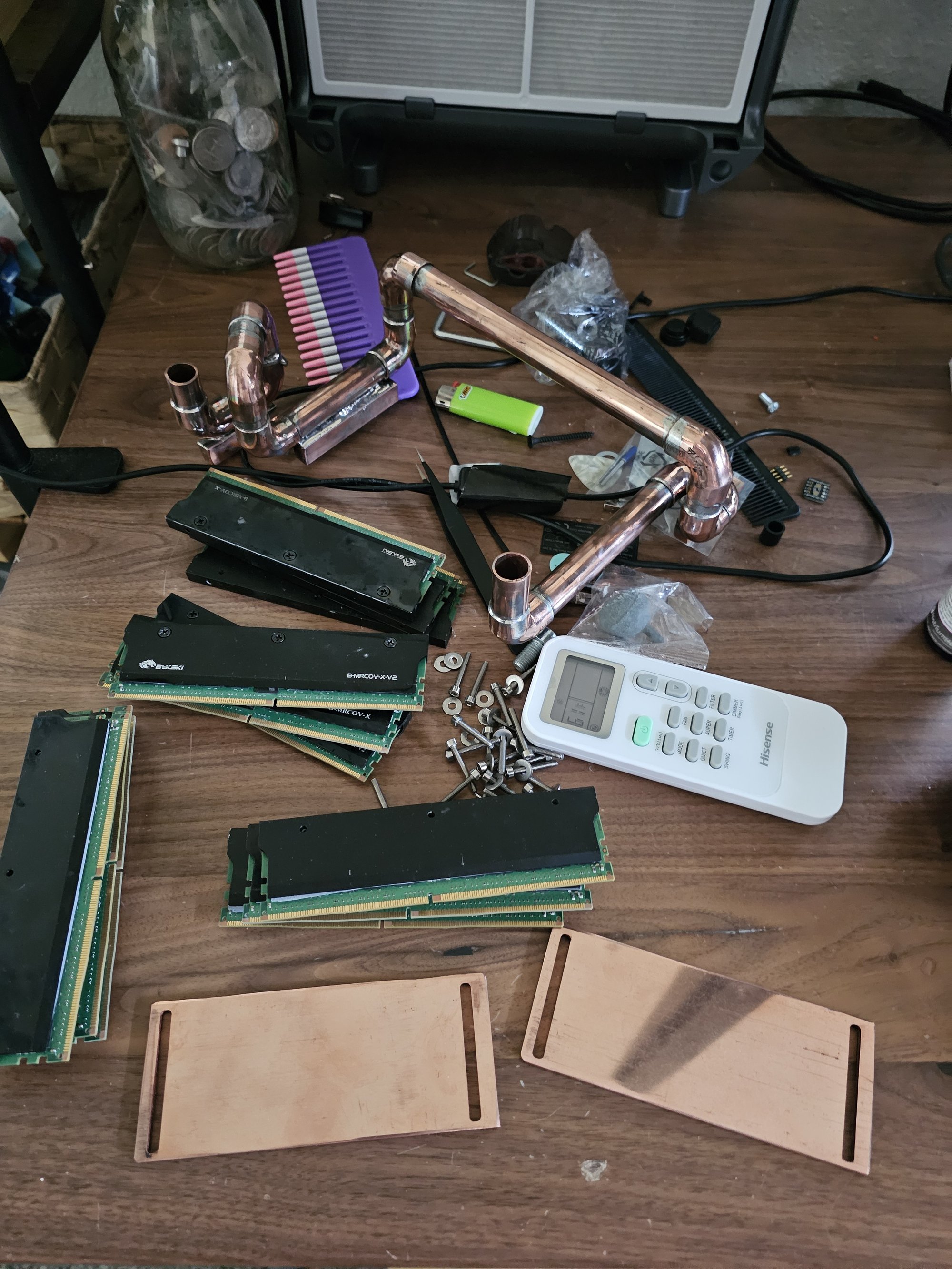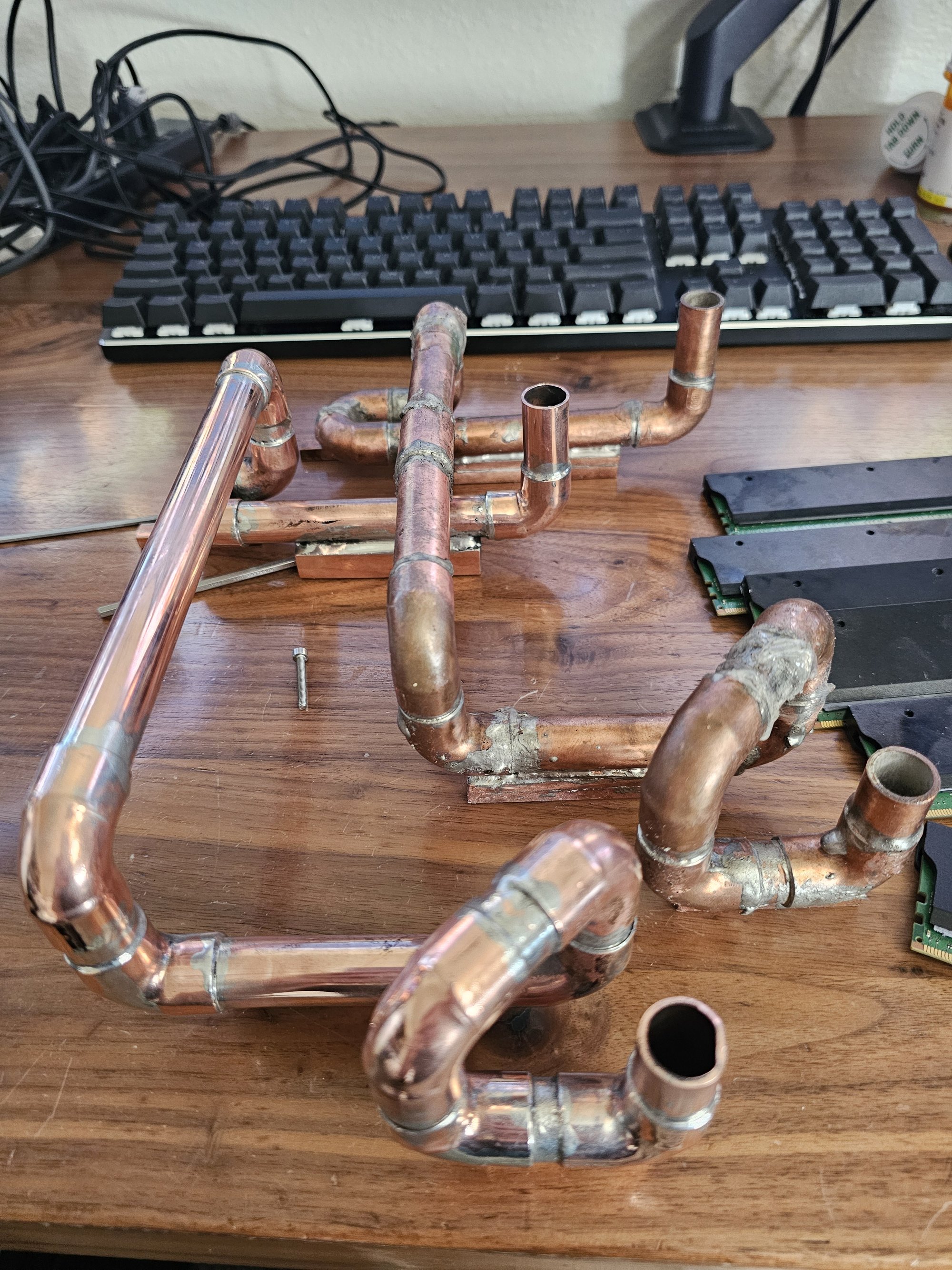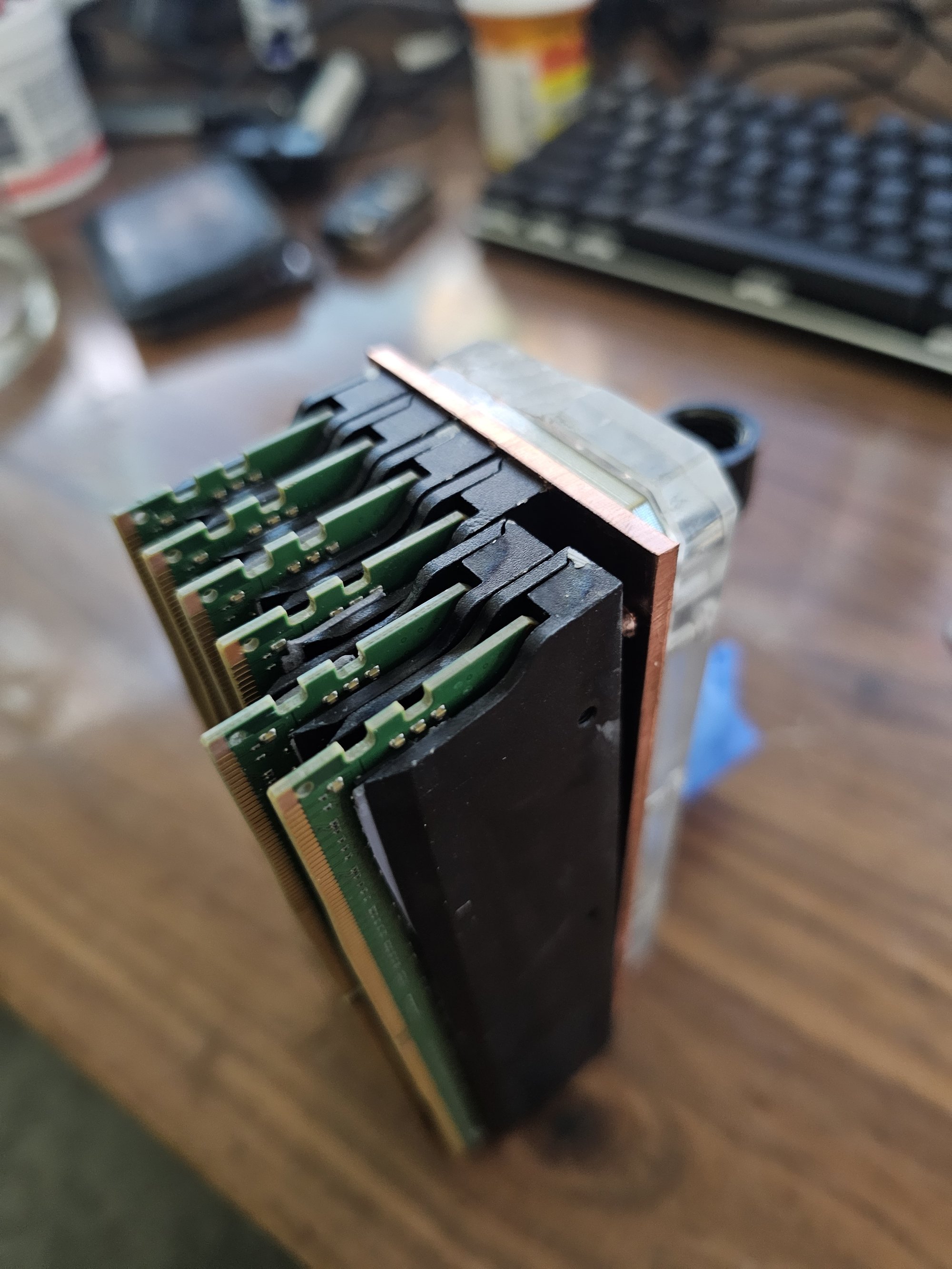 I rebuilt everything. The copper noodle got some major adjustments in the new version to fix a ton of clearance issues and other things. It was also soldered properly this time, and polished. I redid all the ram so it actually fits. I used MX6 to help gap fill the two ram fins on each stick so both sides conduct well. I messed up and used 1mm pads instead of 0.5mm and had to vise squeeze each stick to thin out so they'd fit next to one another.