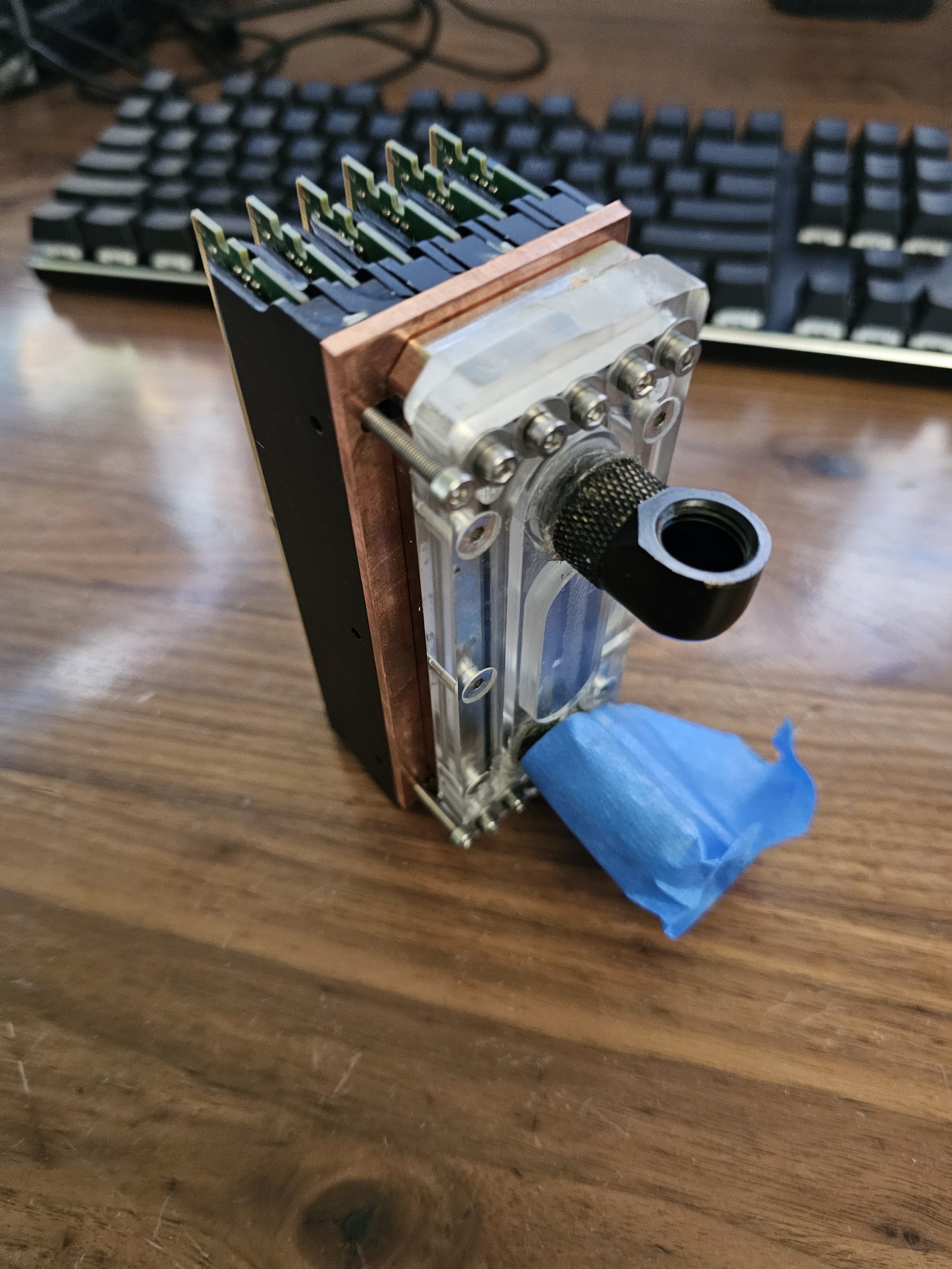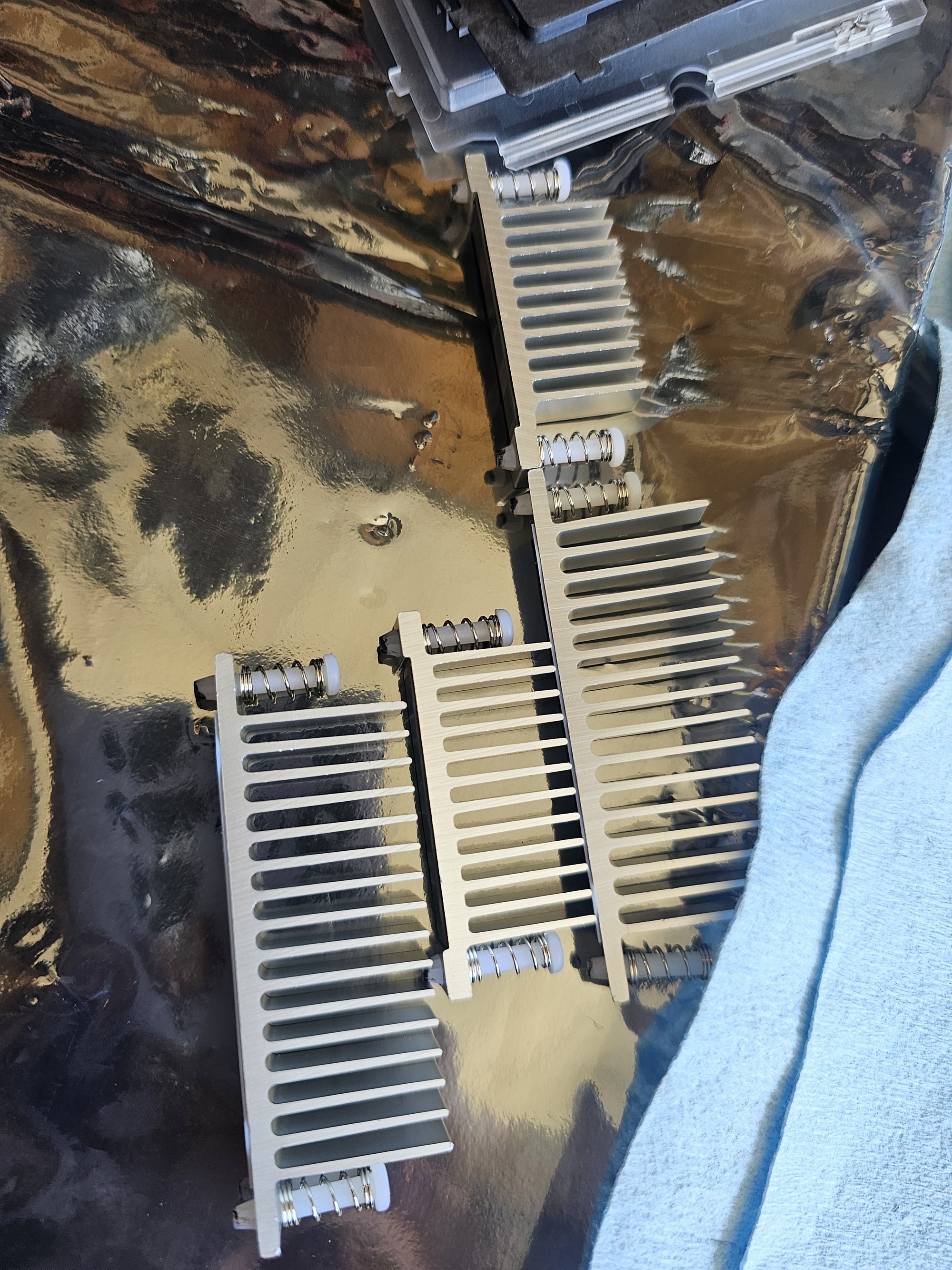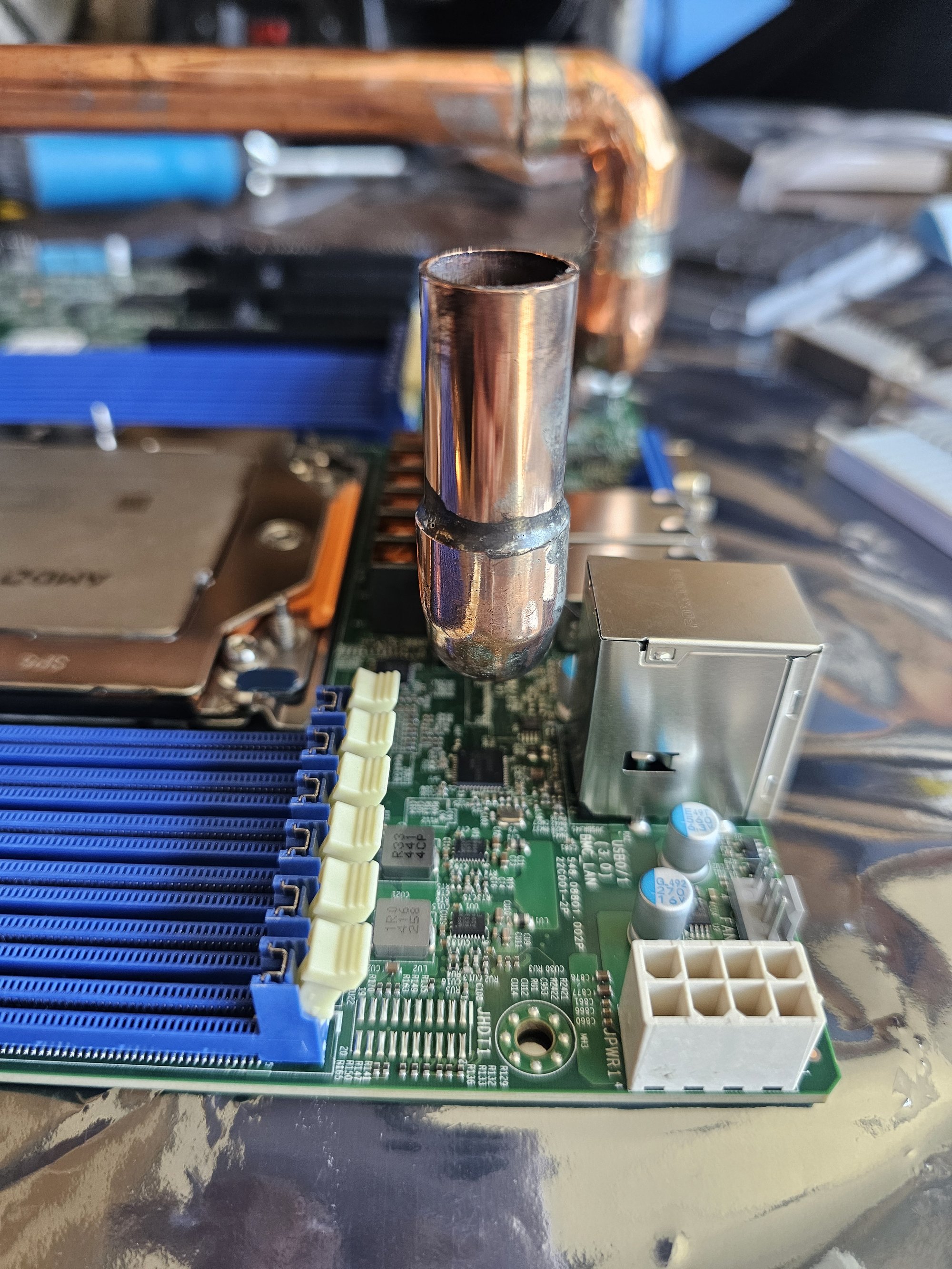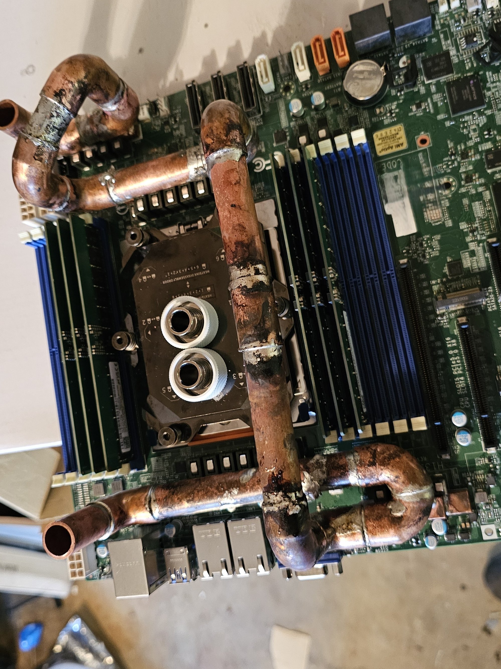 I rebuilt everything. The copper noodle got some major adjustments in the new version to fix a ton of clearance issues and other things. It was also soldered properly this time, and polished. I redid all the ram so it actually fits. I used MX6 to help gap fill the two ram fins on each stick so both sides conduct well. I messed up and used 1mm pads instead of 0.5mm and had to vise squeeze each stick to thin out so they'd fit next to one another.