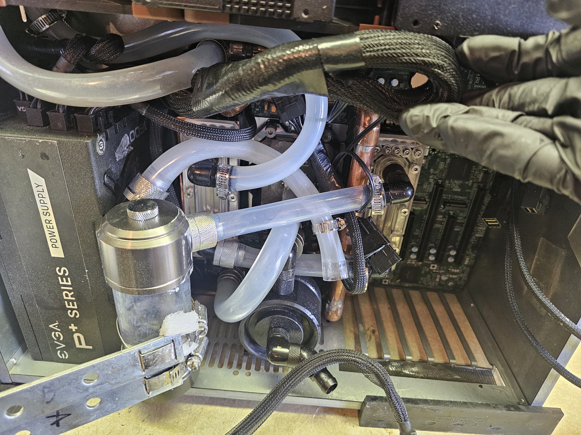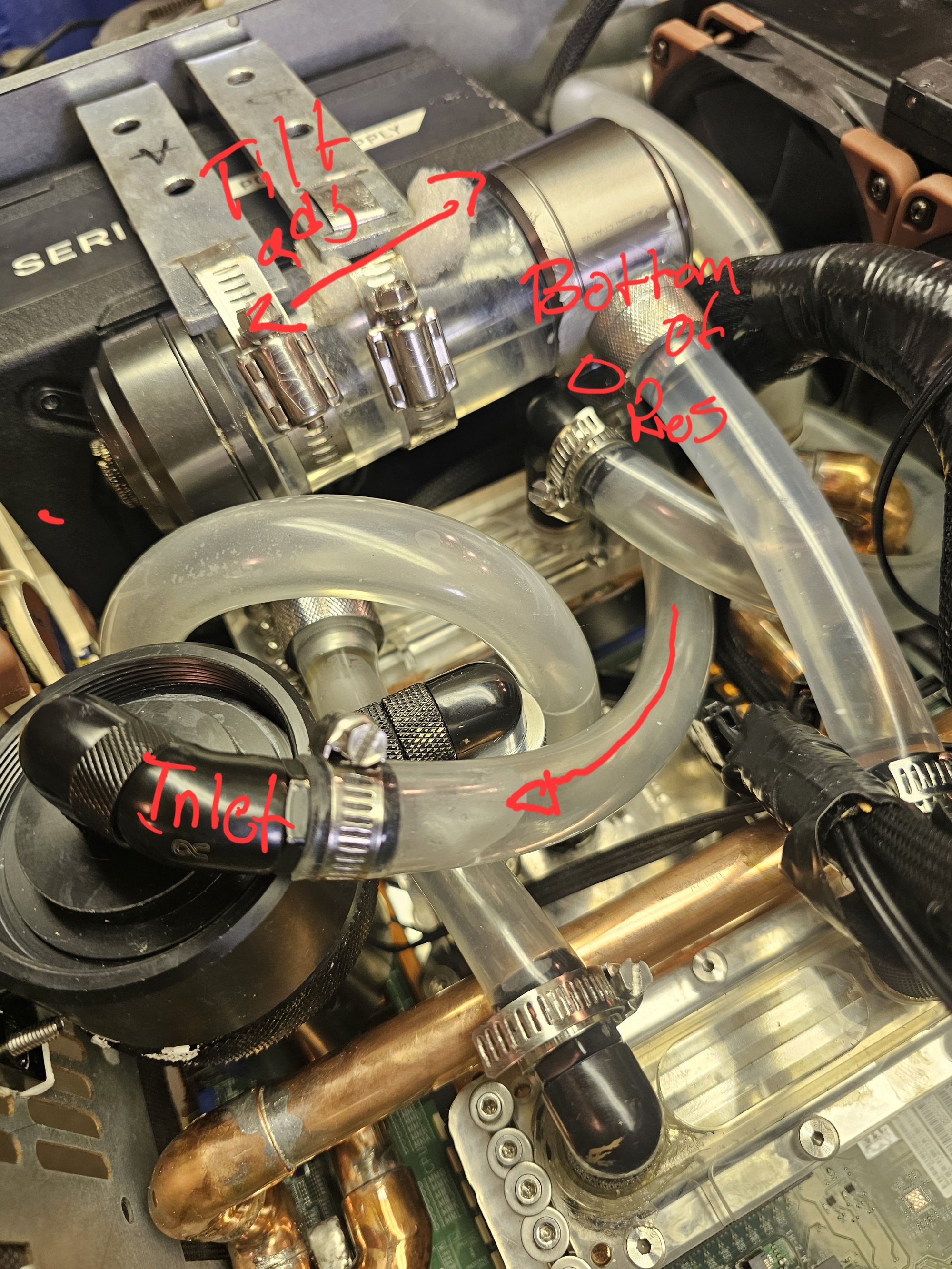 The loop was designed so far as to fit and properly feed the pump from the reservoir while running (pump won't run dry until reservoir is empty). Luckily it worked out in the end, and drains and fills relatively well by flipping the case up on its ends.