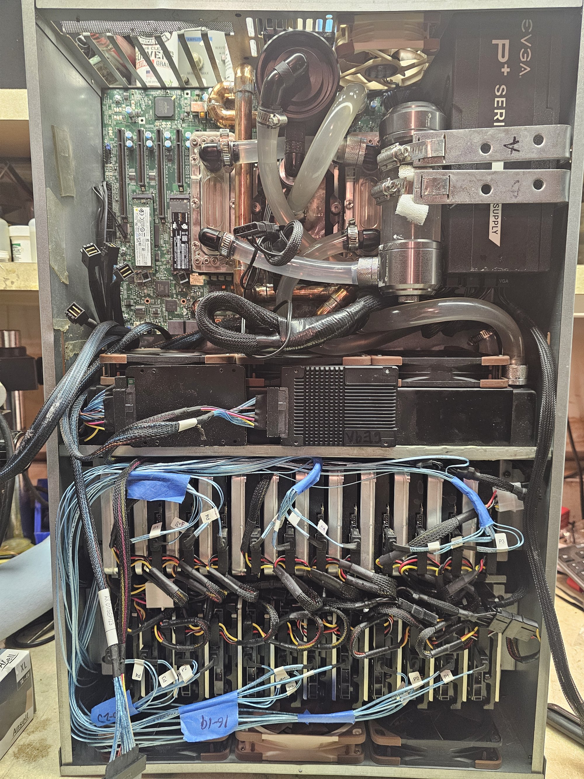This project's goal was to consolidate multiple servers into one machine via virtualization. This allows for greater utilization potential through dynamic allocation of resources. This machine occupies a 4U rack compatible chassis and is liquid cooled on the CPU, VRMs (x4), and RAM (x12).