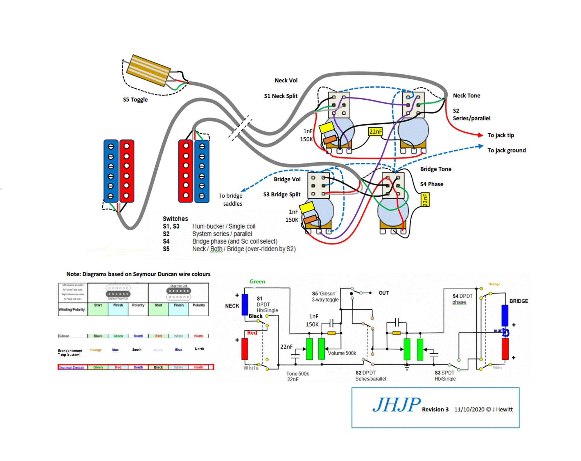 Wiring pickup polarity correctly (with 4 conductor pickups), is a fucking BITCH. Make sure you read over the polarity rules for neck vs bridge pickups, as well as the NS NF SS SF "pinout" correctly.