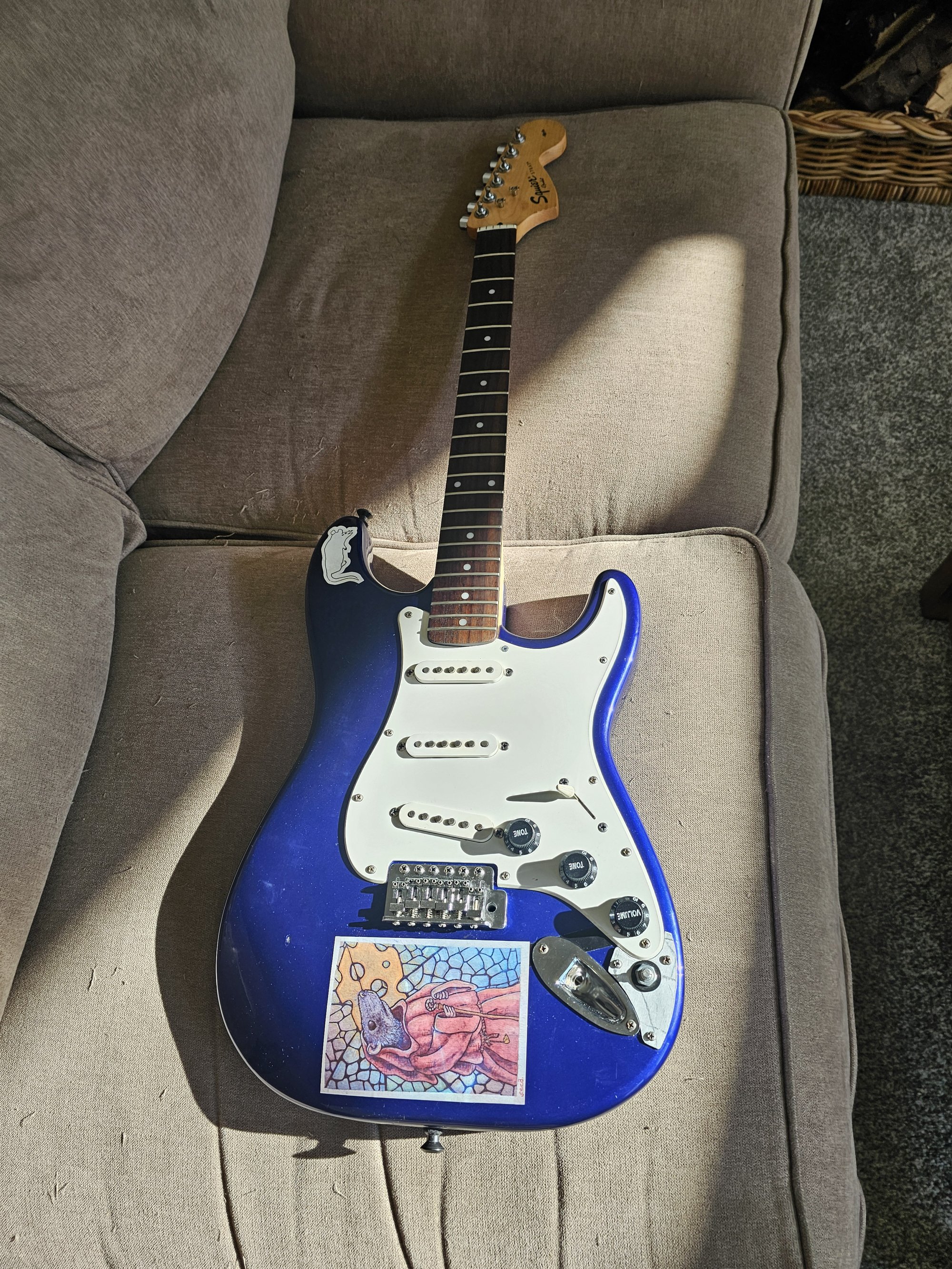 The ultimate grunge guitar. This was a refurbish + modding session on a squier strat. I replaced all the electronics, added a push/pull pot to engage the mid pickup when the bridge? is on, which completes the pickup combinations (best part is running all 3 at once). On top of this I added in a tone cap selector 6 pos rotary switch as a 4th control to see if a strat can be forced to doom chug. I think with some quality high output pickups, this thing will probably be insane. I only had one day to do everything so its all pretty rushed.